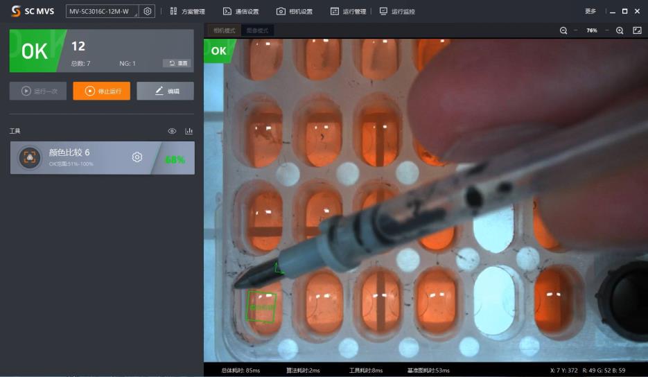 我公司選用sc3000系列智能視覺攝像機,將托盤上的試管轉換成圖像信號,傳輸到圖像軟件處理系統。利用比色等算法工具,根據像素分布、亮度等信息轉換成數字信號,判斷是否正確滴入試管。